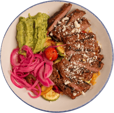 Served of lettuce or arroz: sweet potato, spiced corn, black beans, avocado, pickled red onion and queso fresco